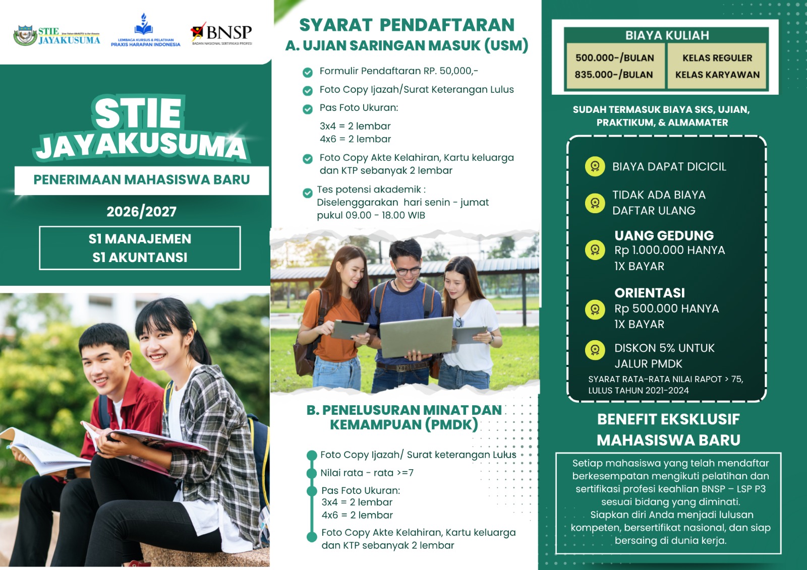 "Mencari tempat untuk mewujudkan mimpi ? STIE Jayakusuma adalah jawabannya ! Kami membuka pendaftaran mahasiswa baru. Dapatkan pengalaman belajar yang tak terlupakan, fasilitas modern, dan peluang karier cemerlang. Daftar sekarang dan jadi bagian dari keluarga besar kami !"